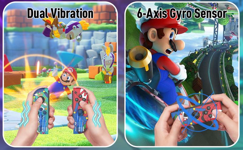 - 【Dual Vibration & 6-Axis Sensor】Each switch controllers joystick is equipped with a 6-axis gyroscope for precise aiming and shooting, while using the latest motion-sensing technology and the latest vibration to provide a great sense of control, making you get a more realistic experience, more accurate strikes and more fantastic controls.